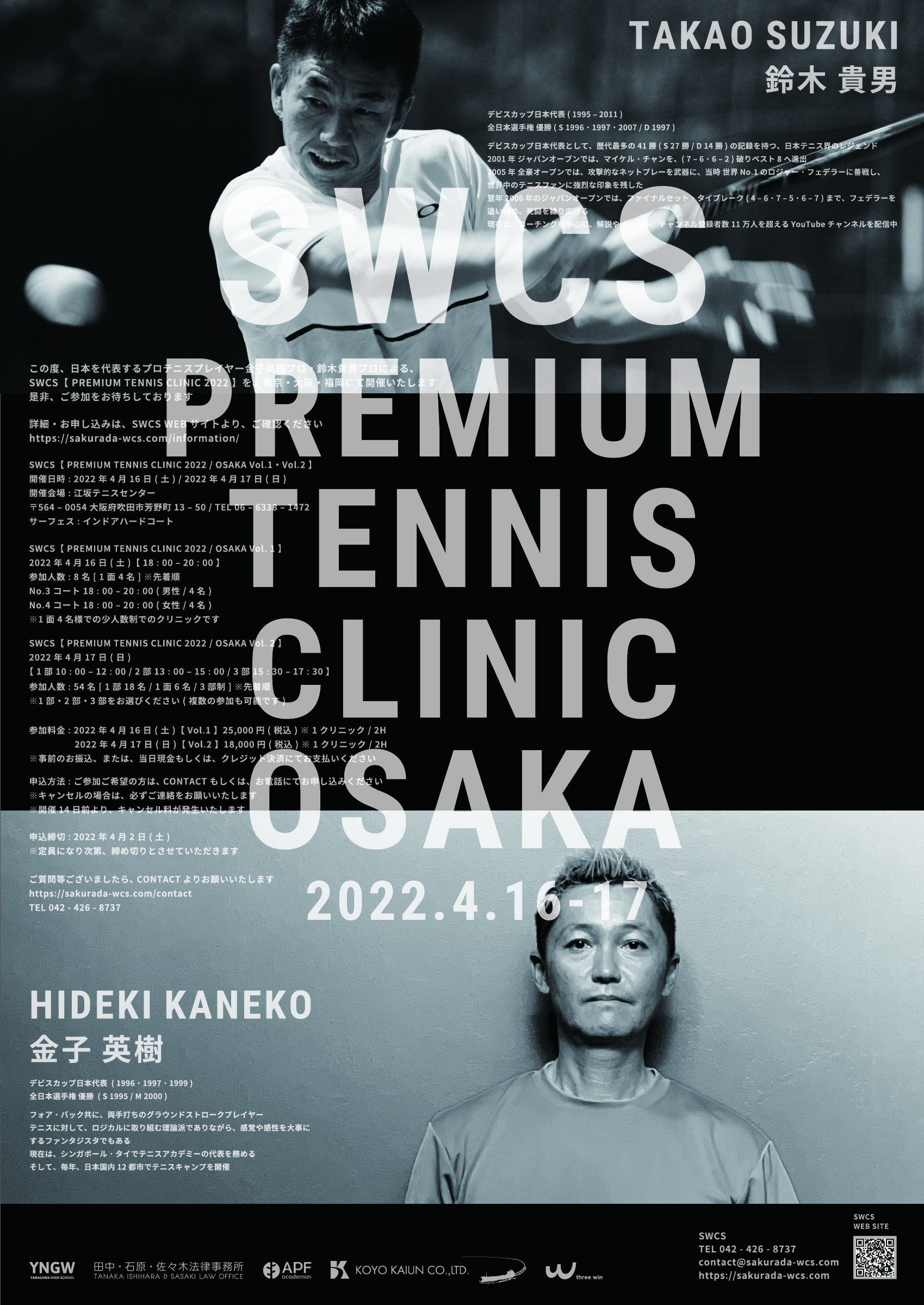 この度、日本を代表するプロテニスプレイヤー金子英樹プロ・鈴木貴男プロによる、【 SWCS PREMIUM TENNIS CLINIC 2022 】を、東京・大阪・福岡にて開催することとなりました。是非、ご参加をお待ちしております。